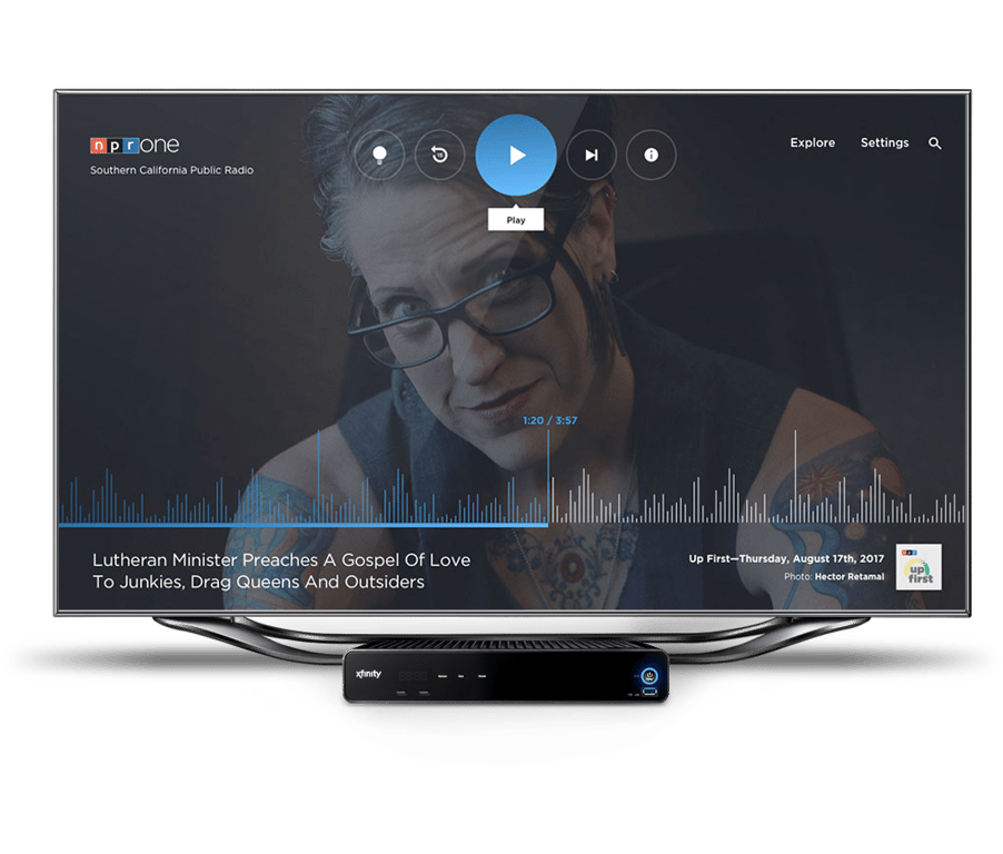 "Every day, people are finding new ways to listen to public radio. NPR One feels right at home on X1, bringing the best local and national news, along with your favorite podcasts, in a personalized experience that gets smarter the more you listen."